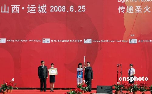 6月25日上午,奧運火炬在山西省運城市傳遞。啟動儀式在南風(fēng)廣場舉行,由山西省手球體育教練張衛(wèi)紅傳遞第一棒。中新社發(fā) 張云 攝