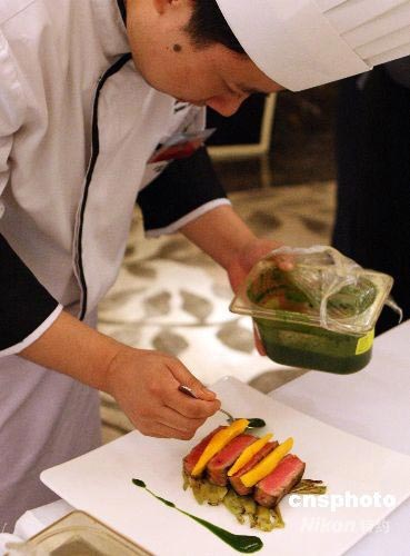 6月25日晚,由國家體育總局訓(xùn)練局、中國烹飪協(xié)會西餐專業(yè)委員會和亨氏公司聯(lián)合主辦的“亨氏冠軍西餐,引領(lǐng)健康美味”主題活動發(fā)布會暨體育概念創(chuàng)意菜肴征集活動頒獎典禮在北京舉行。此次活動歷時近兩個月,吸引了近百家京城優(yōu)秀的西餐廳和潮流餐廳踴躍參與,近百道創(chuàng)意紛呈的體育概念菜肴亮相。左岸春天、漢萊國際美食百匯、梧桐、北京亞太花園酒店、西堤牛排、挪威北極菜、金融街洲際酒店季候風(fēng)、香格里拉飯店藍(lán)韻、希爾頓元素閣和希爾頓三煌苑等十家餐廳所創(chuàng)作的菜品憑借出色的菜肴創(chuàng)意和體育概念闡述,榮獲了本次活動的最高榮譽(yù)“特金獎”。作為本次活動的成果展示和廚藝交流,獲獎餐廳的大廚們現(xiàn)場制作和展示了集健康、美味于一體的體育概念菜品。圖為廚師們現(xiàn)場制作獨(dú)特創(chuàng)意的體育菜肴。 中新社發(fā) 錢興強(qiáng) 攝