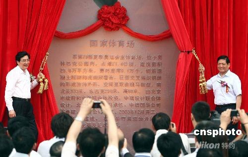 6月28日,2008年北京奧運(yùn)會主體育場(“鳥巢”)落成典禮在北京舉行,北京市委書記、北京奧組委主席劉淇與北京市委副書記、市長、北京奧組委執(zhí)行主席郭金龍等參加落成典禮儀式。圖為劉淇、郭金龍為國家體育場落成紀(jì)念柱揭幕。中新社發(fā) 盛佳鵬 攝