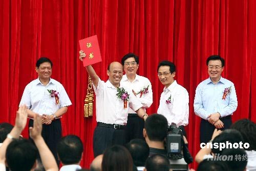 6月28日,北京奧運(yùn)會(huì)主體育場(chǎng)“鳥巢”正式落成,北京市副市長(zhǎng)、北京市“2008”工程指揮部指揮陳剛(右二)在落成典禮上致詞,并向國(guó)家體育場(chǎng)有限責(zé)任公司董事長(zhǎng)李愛慶(左二)交付竣工驗(yàn)收合格證書。中新社發(fā) 盛佳鵬 攝