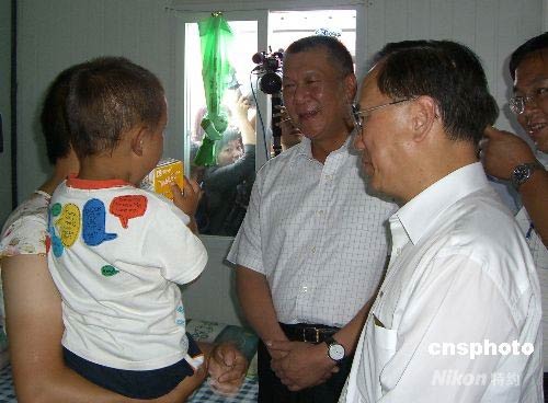 6月28日上午,香港特別行政區(qū)行政長官曾蔭權、澳門特別行政區(qū)行政長官何厚鏵一行來到彭州市小漁洞鎮(zhèn)江橋村大楠社區(qū)安置點,慰問當?shù)厥転娜罕姡私饪拐鹁葹那闆r。中新社發(fā) 郭嘉農(nóng) 攝