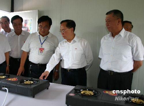 香港特首曾蔭權(quán)、澳門特首何厚鏵一行在四川省副省長(zhǎng)魏宏陪同下,抵達(dá)地震重災(zāi)區(qū)彭州市小漁洞鎮(zhèn)大楠社區(qū)安置點(diǎn),慰問當(dāng)?shù)厥転?zāi)群眾,參觀安置房、公共廚房和安置點(diǎn)內(nèi)的娛樂設(shè)施,并體驗(yàn)了公共廁所。中新社發(fā) 霍潺 攝