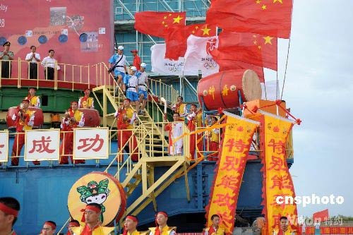 6月28日上午8時,奧運火炬航天城傳遞活動在載人航天發(fā)射塔架下起跑,英雄航天員費俊龍領(lǐng)跑第一棒。 中新社發(fā) 榮鋒 攝