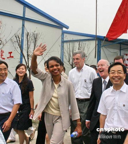 6月29日,美國國務(wù)卿賴斯在四川省副省長黃小祥的陪同下前往四川地震重災區(qū)都江堰慰問當?shù)孛癖。圖為賴斯與安置點的受災民眾揮手告別。中新社發(fā) 黃永莉 攝