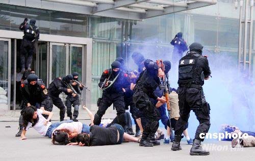 6月30日,山東省反恐怖工作協(xié)調(diào)小組在濟南成功舉行了“泰山2008”反恐演習(xí)。“泰山2008”反恐演習(xí)以北京奧運會期間可能發(fā)生的恐怖襲擊事件為背景,以有效防范和正確處置為課題,主要目的是檢驗和提升山東省城市防范處置恐怖襲擊事件的應(yīng)急反應(yīng)能力、組織指揮能力和綜合保障能力。這次演習(xí)是山東省第一次公安各警種與武警、衛(wèi)生、市政等反恐應(yīng)急力量協(xié)同作戰(zhàn)的合成演習(xí),是第一次以導(dǎo)調(diào)推演方式進行的檢驗性演習(xí),也是第一次通過全省公安視音頻系統(tǒng)同步傳輸?shù)姆纯盅萘?xí)。中新社發(fā) 陳 進 攝