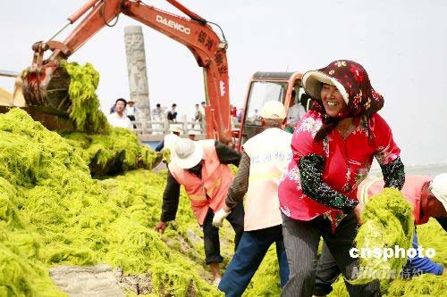 圖為乳山市民眾在近海清理海灘與近海的滸苔。自6月28日以來(lái),在繼奧帆賽舉辦地青島近海出現(xiàn)大量漂浮海藻——滸苔后,距青島僅一個(gè)多小時(shí)車程的乳山市近海也現(xiàn)了大量滸苔,雖然這些滸苔無(wú)毒無(wú)污染,但仍然引起乳山市的高度關(guān)注,目前乳山近海附近三千余民眾正有序地清理著近海滸苔,截止發(fā)稿時(shí)該市已清理滸苔二萬(wàn)余噸。中新社發(fā) 劉國(guó)賢 攝