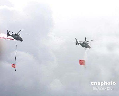 升旗儀式中,直升機(jī)懸掛國(guó)旗、區(qū)旗,噴射彩色煙火掠過金紫荊廣場(chǎng)上空。中新社發(fā) 王麗南 攝