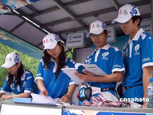 7月1日,來(lái)自北京一所高校的志愿者們正式進(jìn)入海淀區(qū)某街道的志愿者服務(wù)站,開(kāi)始上崗服務(wù)。經(jīng)過(guò)封閉培訓(xùn)、考核通過(guò)的城市志愿者,將在歷時(shí)百天的的服務(wù)日中,向參加北京奧運(yùn)會(huì)、殘奧會(huì)的運(yùn)動(dòng)員、工作人員、觀(guān)眾、記者、游客以及北京市民提供信息咨詢(xún)、應(yīng)急服務(wù)、語(yǔ)言翻譯等多項(xiàng)熱情周到的服務(wù)。中新社發(fā) 馮軍(北京) 攝