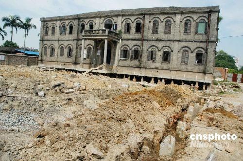 2008年7月3日,福州老洋房泛船浦教堂神父樓在上百個(gè)千斤頂?shù)闹蜗码x地1米,準(zhǔn)備整體平移。這棟老洋房由于位于建設(shè)規(guī)劃范圍內(nèi),經(jīng)過(guò)一年多準(zhǔn)備,福州市有關(guān)部門(mén)決定對(duì)泛船浦教堂神父樓實(shí)施整體平移,以利于文物保護(hù)和減少經(jīng)濟(jì)損失。這幢樓將先往東平移75.6米,再整體旋轉(zhuǎn)90度向南平移30.7米,由東西朝向變?yōu)槟媳背。該教堂建?932年秋,1933年9月落成,耗資17萬(wàn)銀元,建筑風(fēng)格屬半哥特式、半法國(guó)式。中新社發(fā) 張 斌 攝