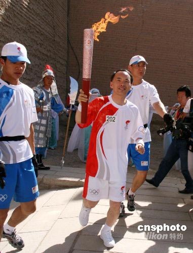 韓國(guó)籍第202棒火炬手李賢求在嘉峪關(guān)關(guān)城內(nèi)進(jìn)行傳遞。中新社發(fā) 周兆軍 攝