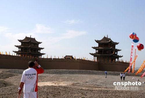 第203棒火炬手楊壯(左)和第204棒火炬手、甘肅省副省長郝遠(yuǎn)在“天下第一雄關(guān)”的城樓上交接火炬。 中新社發(fā) 周兆軍 攝