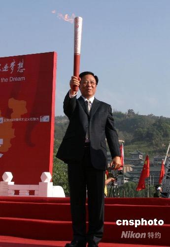 在奧運(yùn)火炬起跑儀式上,甘肅省委書記陸浩高舉火炬向現(xiàn)場民眾展示。 中新社發(fā) 周兆軍 攝