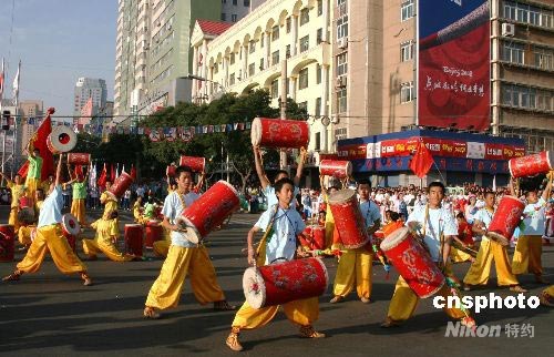 圖:蘭州威風(fēng)鑼鼓為奧運(yùn)火炬?zhèn)鬟f助威