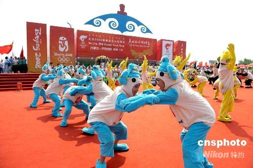 7月8日,奧運火炬在內(nèi)蒙古呼和浩特市傳遞。蒙古族是擅長摔跤的民族,扮成福娃的當(dāng)?shù)睾⑼谶M行“摔跤角力”表演。中新社發(fā) 廖攀 攝