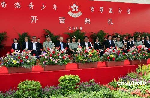 七月十四日,由中國人民解放軍駐港部隊(duì)、軍民同樂活動籌委會、德育關(guān)注組及香港特別行政區(qū)教育局合辦的第四屆“香港青少年軍事夏令營”開營典禮在新界粉嶺“新圍軍營”舉行,香港青少年軍事夏令營發(fā)起人董趙洪娉、中聯(lián)辦主任高祀仁、外交部駐港特派員呂新華、駐港部隊(duì)司令員張仕波少將、政委劉良凱少將、行政長官夫人曾鮑笑薇等主持開營典禮。中新社發(fā) 張勤 攝
