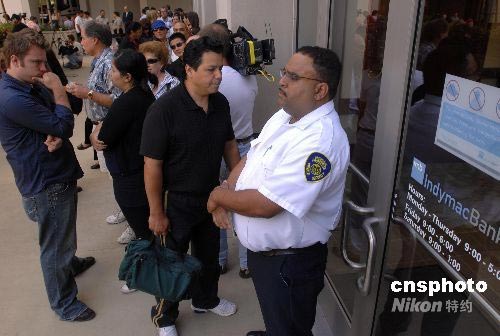 當(dāng)?shù)貢r(shí)間7月14日上午,數(shù)百名儲(chǔ)戶在加州帕薩迪納市的“因迪美聯(lián)邦銀行”門口排隊(duì)等待提取現(xiàn)金。 受次貸危機(jī)影響,6月底以來,美國最大的抵押貸款商因迪美銀行(IndyMac Bank)遭客戶擠兌,在11天內(nèi)被客戶提走現(xiàn)金13億美元,本月11日,因流動(dòng)性嚴(yán)重不足,該銀行被美國儲(chǔ)蓄管理局勒令關(guān)閉,并將其業(yè)務(wù)轉(zhuǎn)交至聯(lián)邦存款保險(xiǎn)公司運(yùn)營(yíng),該銀行成為美國次貸危機(jī)以來被關(guān)閉的最大抵押貸款商。被接管并更名后的“因迪美聯(lián)邦銀行”14日開始營(yíng)業(yè),大批客戶仍擔(dān)心財(cái)產(chǎn)受損,一大早便排隊(duì)等待提現(xiàn)。中新社發(fā) 張煒 攝