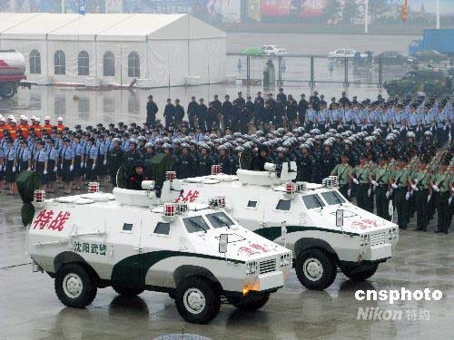 7月15日,2008北京奧運(yùn)會沈陽火炬?zhèn)鬟f暨奧足賽安保決戰(zhàn)誓師大會冒雨在沈陽奧體中心舉行,來自交警、消防、特警、武警、救護(hù)、檢疫、行政執(zhí)法的12個方隊(duì)進(jìn)行了誓師宣言,同時武警、特警、交警等警種展示了他們高科技的武器裝備。中新社發(fā) 趙敬東 攝