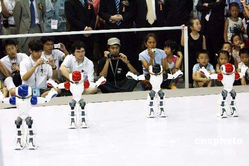 7月16日,2008機(jī)器人世界杯賽在蘇州國際博覽中心舉行,約有來自30個(gè)國家的300多支隊(duì)伍的1400多名參賽者及學(xué)者參加此次比賽和學(xué)術(shù)研討會(huì)。據(jù)悉,本屆機(jī)器人世界杯賽是首次在中國舉辦,同時(shí)也開創(chuàng)了在發(fā)展中國家舉辦機(jī)器人世界杯賽的先河。中新社發(fā) 徐志強(qiáng) 攝