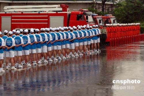 7月16日下午,奧運(yùn)火炬在吉林延吉傳遞,消防隊(duì)員和火炬護(hù)跑手整齊列隊(duì)等待出發(fā)。 中新社發(fā) 廖攀 攝
