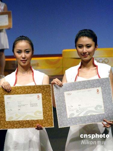奧運(yùn)禮儀志愿者展示2008北京奧運(yùn)頒獎(jiǎng)證書(shū)。中新社發(fā) 王東明 攝