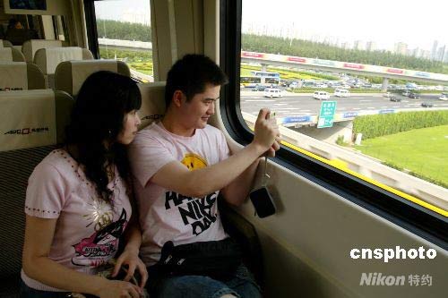 圖為一對(duì)情侶在機(jī)場(chǎng)專(zhuān)線上用相機(jī)拍攝沿途美景。