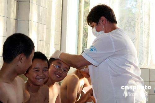 7月19日,184名來自中國四川地震災區(qū)兒童抵達黑海岸邊的全俄“雛鷹”兒童中心,進行三周康復療養(yǎng)。圖為兒童中心的醫(yī)生為這些初到的中國小客人檢查身體。中新社發(fā) 田冰 攝