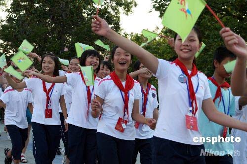 7月20日,位于黑海岸邊的全俄“雛鷹”兒童中心舉行今年第八期夏令營(yíng)開營(yíng)儀式,并隆重歡迎來(lái)此療養(yǎng)的四川地震災(zāi)區(qū)的中小學(xué)生代表團(tuán)。圖為四川地震災(zāi)區(qū)中小學(xué)生入場(chǎng)受到熱烈歡迎。中新社發(fā) 田冰 攝