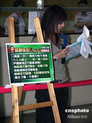 7月21日上午,臺北地方法院開庭審理臺灣前海軍軍官雷學明控告臺灣地區(qū)前領導人陳水扁等人誹謗案。這是陳水扁卸任后首度至法院出庭,臺灣媒體對此高度關注。圖為在臺北地院內,媒體制作看板,女記者在現(xiàn)場報道案情審理進展。中新社發(fā) 徐長安 攝