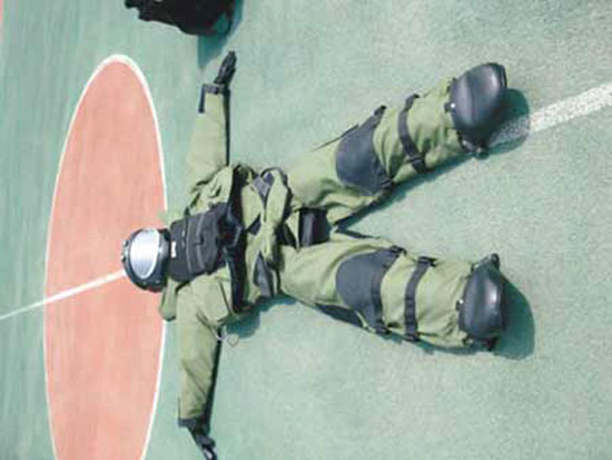 排爆服能夠防護(hù)爆炸后產(chǎn)生的超壓、碎片、沖擊波,對排爆專家進(jìn)行全方位的保護(hù)。其頭盔里,裝有智能型電池驅(qū)動電源系統(tǒng)和排風(fēng)系統(tǒng),還有智能式聲音放大器及巨響防護(hù)裝置。排爆服“躺”在地上,就像一個人。它是目前世界上最先進(jìn)的防爆服,歷經(jīng)5年時間在全新平臺上研制出來,具備最新的模塊化防護(hù)組合,提供更高的防護(hù)能力。它的配置更加齊全,腕部配有頭盔遙控器,調(diào)節(jié)和控制更加方便。頭盔面罩可以掀起,頭盔上方配備高亮度發(fā)光二極管照明燈,操作更加方便。一米范圍內(nèi),500克炸藥爆炸不會危及排爆者的生命。