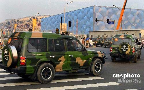 圖:大批軍車進駐北京奧運會主場館區(qū)域