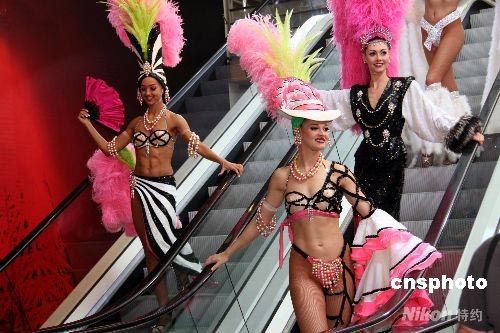 7月24日下午,法國巴黎著名的麗都夜總會(huì)的舞娘在巴黎老佛爺百貨男裝館,為游人和顧客獻(xiàn)上風(fēng)情萬種的火辣演出,為巴黎老佛爺百貨公司在今夏七月推出的特別促銷活動(dòng)助陣。中新社發(fā) 王倩 攝