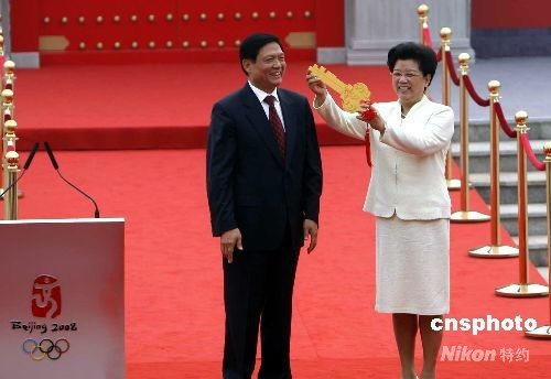 7月27日,北京奧運村開村。北京市委書記、北京奧組委執(zhí)行主席劉淇向奧運村村長、北京奧組委副主席陳至立移交奧運村鑰匙。中新社發(fā) 杜洋 攝