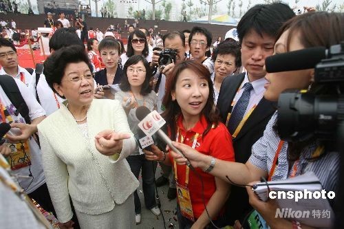7月27日,北京奧運(yùn)會的運(yùn)動員之家——奧運(yùn)村正式開村,來自205個國家和地區(qū)的16000名運(yùn)動員和隨隊(duì)官員將逐步入住。圖為奧運(yùn)村村長陳至立接受香港媒體采訪。中新社發(fā) 武仲林 攝