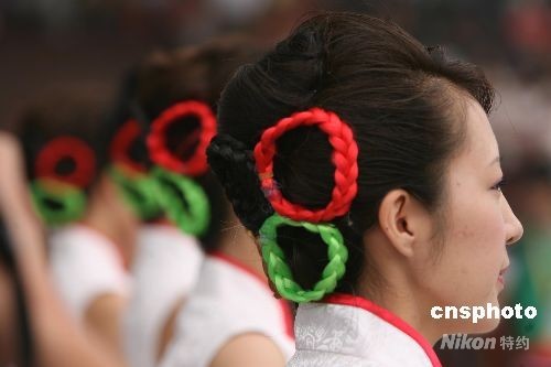 7月27日,北京奧運(yùn)會(huì)的運(yùn)動(dòng)員之家——奧運(yùn)村正式開村,來自205個(gè)國(guó)家和地區(qū)的16000名運(yùn)動(dòng)員和隨隊(duì)官員將逐步入住。圖為出席中國(guó)代表團(tuán)升旗儀式的禮儀小姐。中新社發(fā) 武仲林 攝