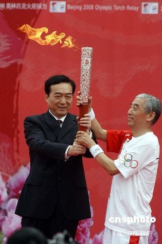 7月27日,河南省委副書(shū)記陳全國(guó)將火炬交于河南洛陽(yáng)第一棒火炬手張海(右)手中,張海是當(dāng)代中國(guó)書(shū)法掌門人。當(dāng)日,北京奧運(yùn)接力到河南省洛陽(yáng)市。中新社發(fā) 慎重 攝