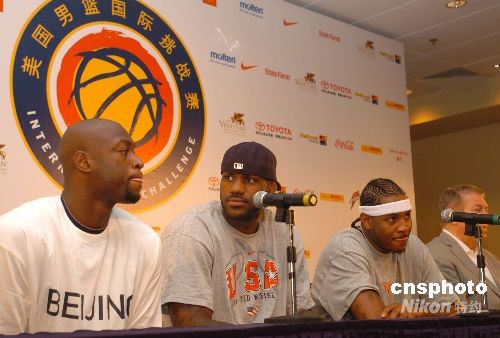 圖為七月二十八日抵達澳門的美國球員德懷恩·韋德(左一)、勒布朗·詹姆斯(左二)及卡梅隆·安東尼出席記者會。美國國家男籃隊將于七月三十一日及八月一日在澳門與土耳其及立陶宛隊進行兩場奧運熱身賽。中新社發(fā) 畢永光 攝