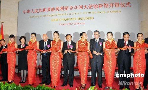 中國駐美大使館新館,當地時間七月二十九日傍晚舉行開館儀式,中美多名部長和各界名流千余人出席,圖為中國外長楊潔篪(中)、駐美大使周文重(右二)、常駐聯合國代表王光亞(左一)和美國財長保爾森(左五)、商務部長古鐵雷斯(右四)、勞工部長趙小蘭(左三)、常務副國務卿內格羅蓬特、總統(tǒng)國家安全事務副助理杰弗里等等為新館開館剪彩。中新社發(fā) 邱江波 攝
