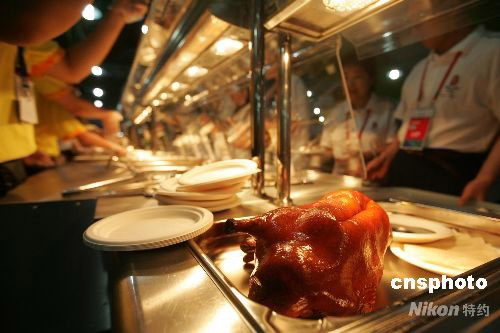 7月30日,北京奧運(yùn)村餐廳正在精心準(zhǔn)備著名的北京烤鴨。北京奧運(yùn)村已正式開村,入住者可以享受到自己喜歡的各種衛(wèi)生可口的飯菜。各國(guó)運(yùn)動(dòng)員在奧運(yùn)村餐廳可品嘗到正宗的北京全聚德烤鴨。奧運(yùn)村餐廳每天為運(yùn)動(dòng)員提供600只烤鴨,而且都是由服務(wù)員卷好的由烤鴨片、黃瓜條、蔥絲組合的烤鴨卷。 奧運(yùn)村餐廳每天24小時(shí)提供餐飲服務(wù),每小時(shí)提供不少于6000人的用餐,有450多種食物品種,運(yùn)動(dòng)員菜品7天不重復(fù)。北京奧運(yùn)會(huì)的餐飲服務(wù)被廚師們比喻為“餐飲業(yè)的奧運(yùn)會(huì)”。據(jù)北京奧組委預(yù)計(jì),奧運(yùn)期間供餐將超過1300萬(wàn)份。要讓所有用餐者吃得可口更要吃得安全,對(duì)于每一位“奧運(yùn)廚師”來說都是一次極大的考驗(yàn)。 北京奧運(yùn)會(huì)奧運(yùn)村部副部長(zhǎng)鄧亞萍表示:“我們聘請(qǐng)了具有8屆夏季奧運(yùn)會(huì)和5屆冬奧會(huì)餐飲服務(wù)經(jīng)驗(yàn)的國(guó)際餐飲公司承擔(dān)奧運(yùn)村的主餐廳、分餐廳和國(guó)際區(qū)咖啡廳的餐飲服務(wù)工作,共有100位來自世界各國(guó)的外籍工作人員和2300位來自全國(guó)各地的廚師和服務(wù)人員,從27日開始24小時(shí)為村民提供可口的飯菜。”