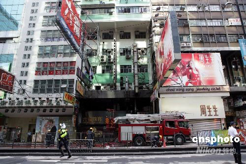 八月十日下午三時(shí)許,香港旺角嘉禾大廈的五級(jí)火警被救熄,此次大火中兩名消防員殉職,一名老婦死亡,另五十六人受傷;鹁诋(dāng)天九時(shí)許發(fā)生,焚燒了近六個(gè)小時(shí)。中新社發(fā) 洪少葵 攝
