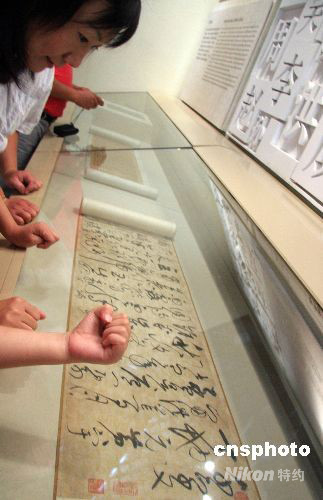 8月11日,觀眾在中國(guó)科技館新館內(nèi)仔細(xì)欣賞中國(guó)古代一位皇帝——宋徽宗趙佶的書法作品真跡。趙佶雖然皇帝做得不怎么樣,卻以獨(dú)創(chuàng)的“瘦金體”書法和高超的工筆繪畫藝術(shù),為中國(guó)書畫藝術(shù)發(fā)展作出重要貢獻(xiàn)。中新社發(fā) 孫自法 攝
