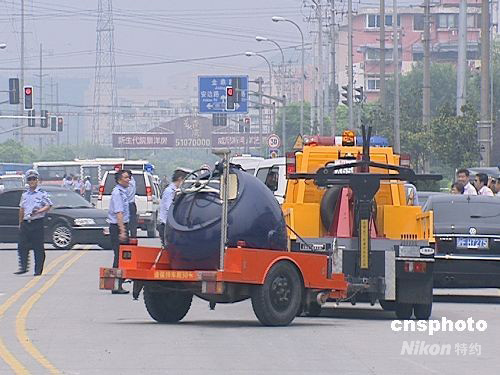 圖為上海警方啟用防爆裝置,把疑似爆炸物轉(zhuǎn)移。中新社發(fā) 宣克炅 攝