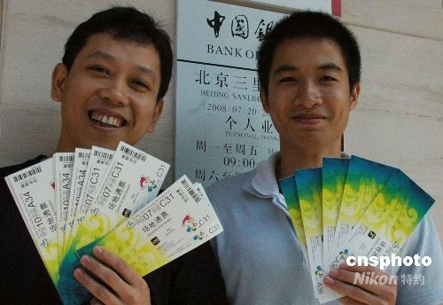 8月15日,2008年北京殘奧會(huì)體育比賽門票在北京地區(qū)的30個(gè)中國(guó)銀行門票代售網(wǎng)點(diǎn)銷售,并提供現(xiàn)場(chǎng)打印門票服務(wù)。公眾持有效身份證件在代售網(wǎng)點(diǎn)排隊(duì)實(shí)時(shí)購(gòu)票,每人每次最多買2個(gè)場(chǎng)次共10張門票。目前共有205個(gè)比賽場(chǎng)次80萬(wàn)張比賽門票供銷售,購(gòu)票時(shí)間截至到9月17日。圖為來自廣東的民眾高興地買到殘奧會(huì)門票。 中新社發(fā) 張雙雙 攝