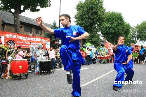 當(dāng)?shù)貢r(shí)間25日,歐洲最大規(guī)模的街頭文化藝術(shù)節(jié)——一年一度的英國(guó)諾丁山狂歡節(jié)在倫敦舉行,今年的主題是“歡迎世界”。圖為當(dāng)?shù)厍嗄暝诒硌葜袊?guó)武術(shù)。中新社發(fā) 李鵬 攝