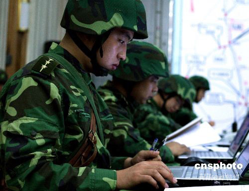 中國(guó)人民解放軍“勵(lì)兵--2008”演練8月26日拉開帷幕。當(dāng)日上午濟(jì)南軍區(qū)某機(jī)械化步兵旅指揮機(jī)關(guān)向所屬部隊(duì)下達(dá)了進(jìn)入戰(zhàn)備狀態(tài)命令,部隊(duì)迅速進(jìn)入戰(zhàn)位嚴(yán)整以待,戰(zhàn)備狀態(tài)將隨時(shí)升級(jí)。中新社發(fā) 宋吉河 攝