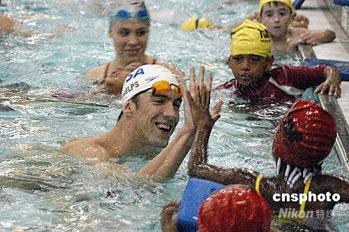 8月28日,在北京奧運(yùn)會(huì)上手握八金的美國泳將菲爾普斯出現(xiàn)在紐約青年會(huì)游泳館,希望通過親身傳授“泳技”,讓更多孩子開始自己的奧運(yùn)夢想。中新社發(fā) 魏晞 攝