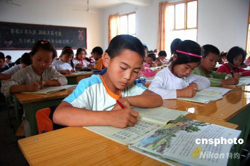 9月1日,四川阿壩州汶川地震災(zāi)區(qū)的600余名學(xué)生在瀘州市第十中學(xué)校經(jīng)過兩周的環(huán)境適應(yīng)后,正式進(jìn)入過渡復(fù)課。圖為11歲的田旭翔正在自習(xí)課上認(rèn)真地做語文作業(yè)。中新社發(fā) 牟科 攝