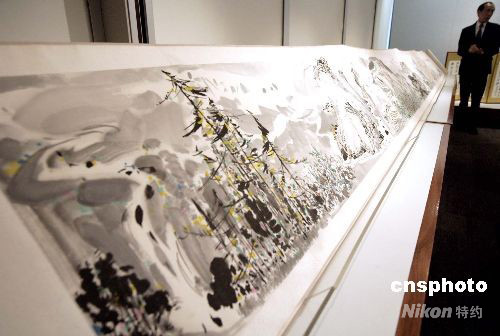 香港蘇富比二〇〇八年秋季中國書畫拍賣會將于十月六日在香港會展中心舉行,拍品總數(shù)超過二百四十件,云集多位書畫名家的優(yōu)秀作品,其中吳冠中、張大千作品成為焦點(diǎn)。圖為九月九日舉行的傳媒預(yù)展會上介紹吳冠中《長江萬里圖》,拍賣所得將捐贈(zèng)“吳冠中科學(xué)與藝術(shù)創(chuàng)新獎(jiǎng)學(xué)基金”。中新社發(fā) 張勤 攝