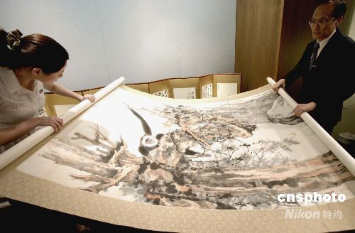香港蘇富比2008秋季中國(guó)書(shū)畫(huà)拍賣會(huì)將于十月六日在香港會(huì)展中心舉行,其中吳冠中、張大千作品成為焦點(diǎn)。圖為九月九日舉行的傳媒預(yù)展會(huì)上介紹張大千一百一十歲誕辰紀(jì)念專輯之作,于一九五九年的《老樹(shù)騰猿》。中新社發(fā) 張勤 攝