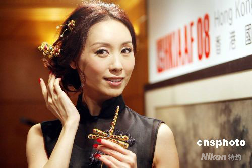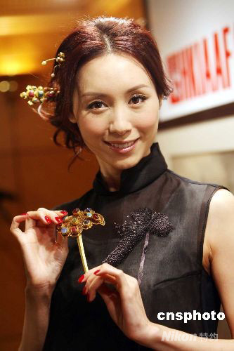 九月十日,香港藝人郭可盈展示明代黃金發(fā)飾。當(dāng)日,香港國(guó)際藝展公司向傳媒預(yù)展一批將在十月四日在“2008香港國(guó)際古玩及藝術(shù)品博覽會(huì)”上拍賣的珍品。中新社發(fā) 洪少葵 攝