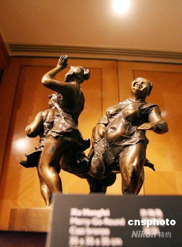 九月十日,香港國際藝展公司向傳媒展示當(dāng)代中國雕塑家許鴻飛的鑄銅雕塑“團(tuán)團(tuán)轉(zhuǎn)”。該公司主辦的 “2008香港國際古玩及藝術(shù)品博覽會”將在十月四日至七日在會展中心舉行。中新社發(fā) 洪少葵 攝